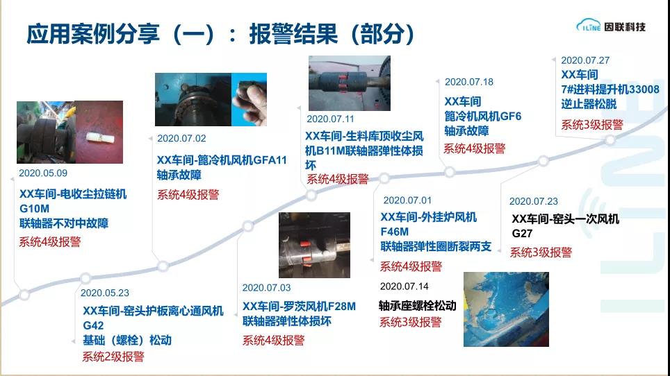 針對(duì)工廠級(jí)設(shè)備運(yùn)維,因聯(lián)根據(jù)設(shè)備產(chǎn)線結(jié)合實(shí)際工況,搭建適合廠級(jí)設(shè)備的運(yùn)維管理系統(tǒng),基于設(shè)備智能預(yù)警和診斷,減少巡檢人員數(shù)量,提高巡檢效率并提供備品備件預(yù)測(cè)管理。以典型的流程化行業(yè)水泥行業(yè)為例,覆蓋了石灰石場(chǎng)、生料制備、熟料燒成、水泥粉磨、水泥包裝和余熱發(fā)電的全工藝流程監(jiān)測(cè)方案,可提供從無(wú)線感知、有線感知,工藝、油液、溫度和圖像等監(jiān)測(cè)手段,到設(shè)備模型建立、數(shù)據(jù)算法訓(xùn)練、預(yù)警算法模型和診斷算法模型的設(shè)備預(yù)測(cè)性維護(hù)完整解決方案,從而實(shí)現(xiàn)對(duì)廠級(jí)客戶所有關(guān)鍵生產(chǎn)設(shè)備的完全覆蓋。